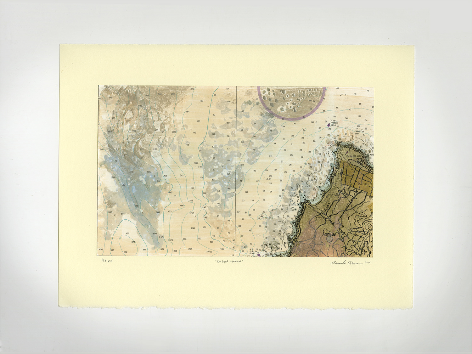 This is a hot stamped foil print series (variable edition of 8, 15 × 11 in) printed on salvaged map pieces with many layers of metallic, pearlescent, and tint foil, backed with cream Stonehenge paper. The source map was a US topographical survey of the coast of California - each print is one cut segment of the original map.