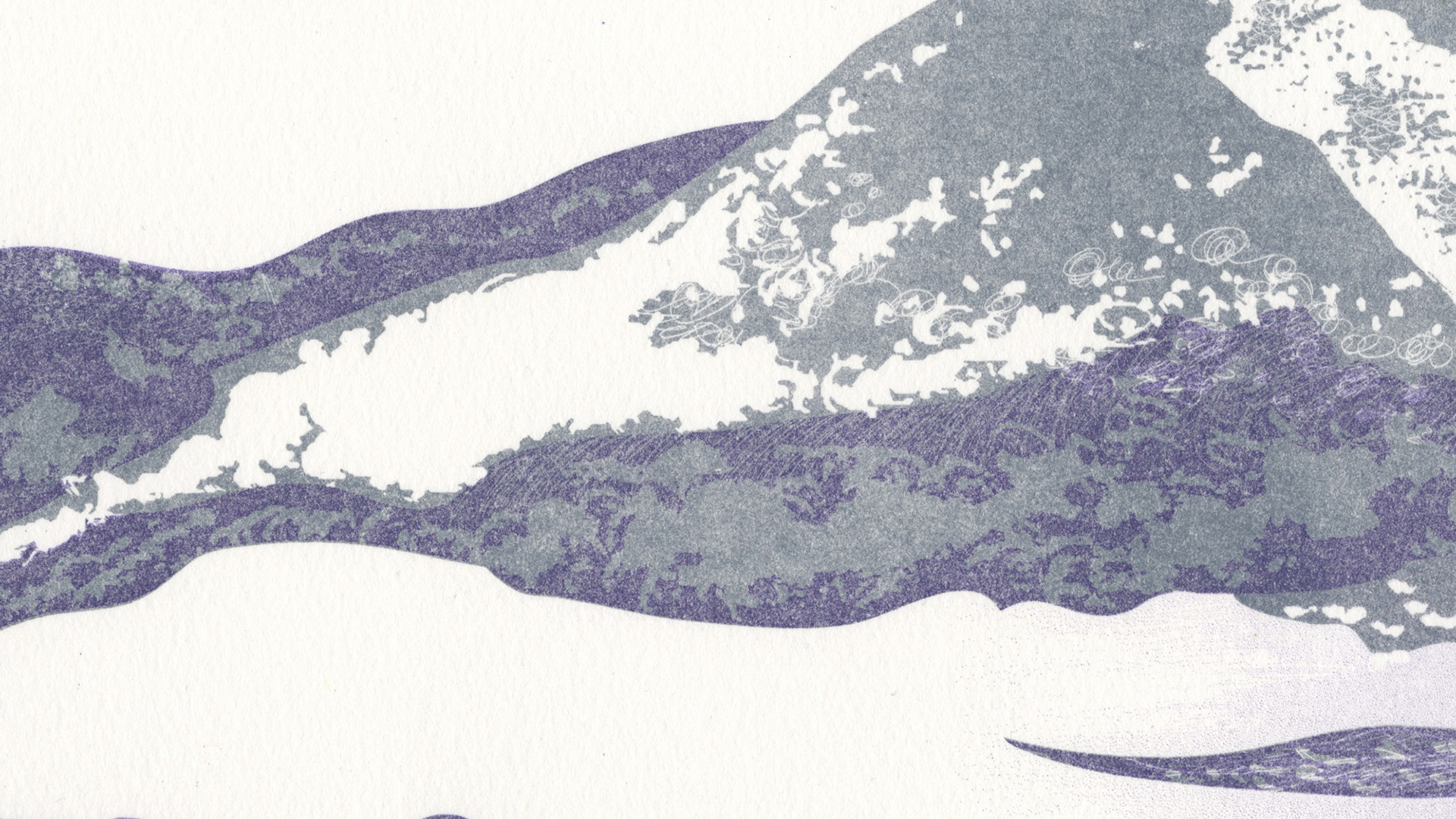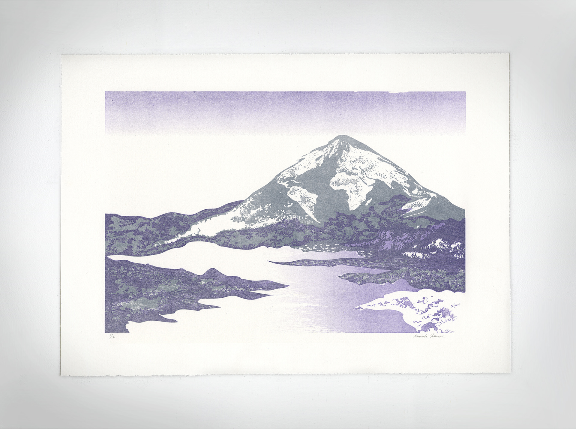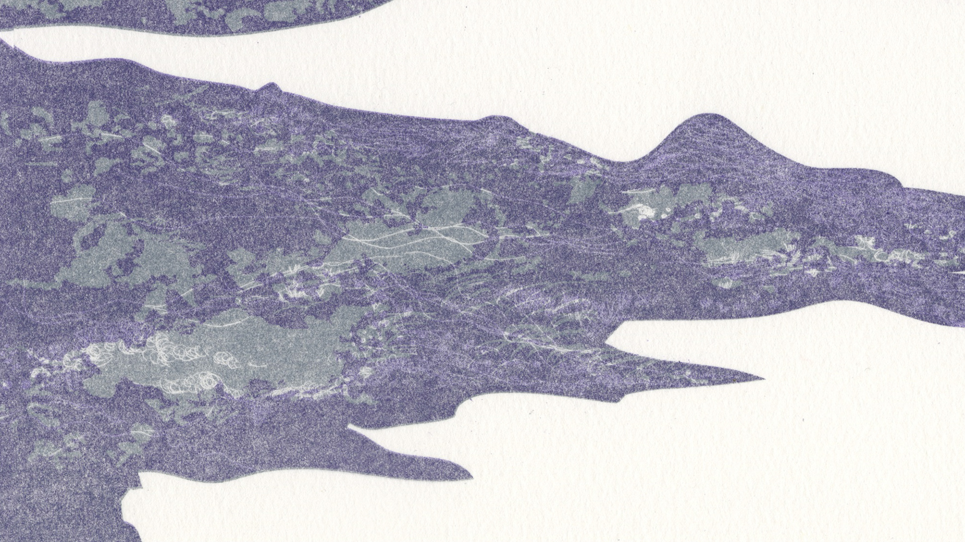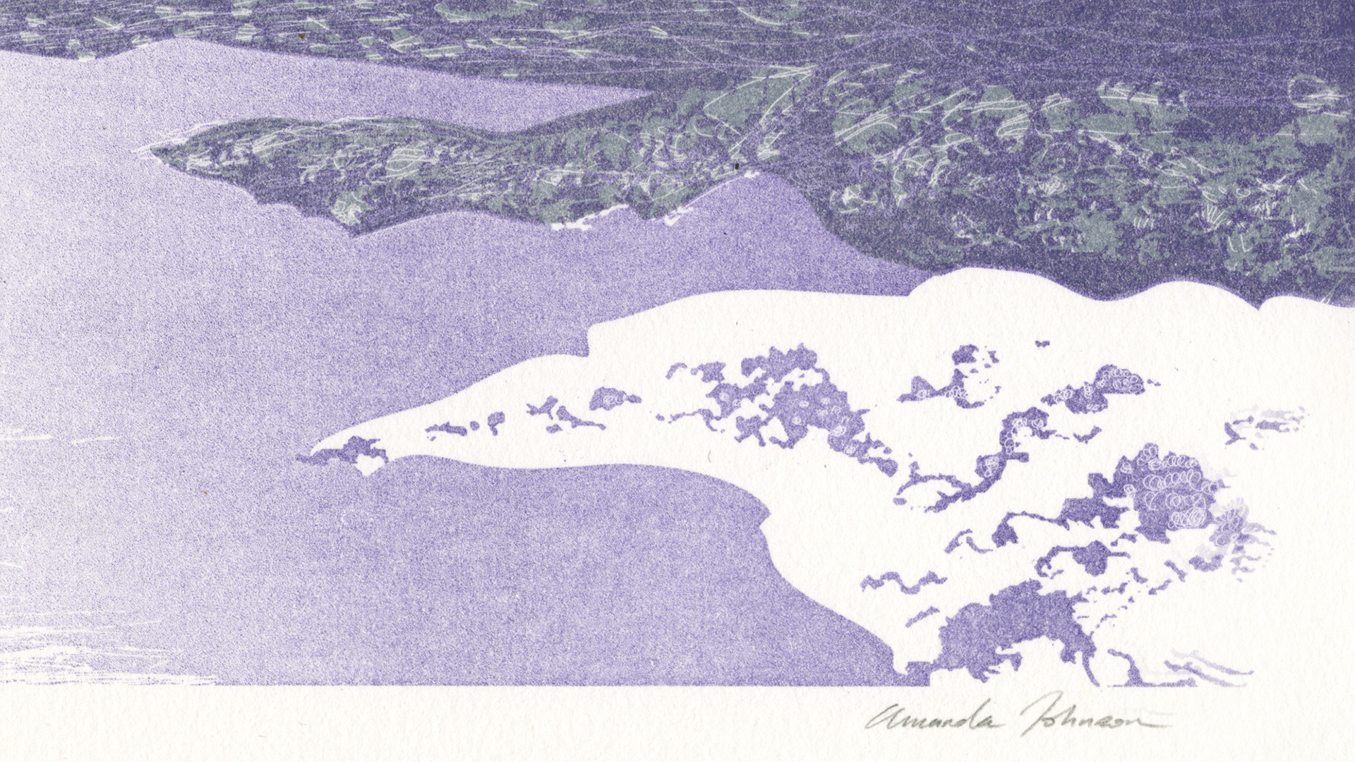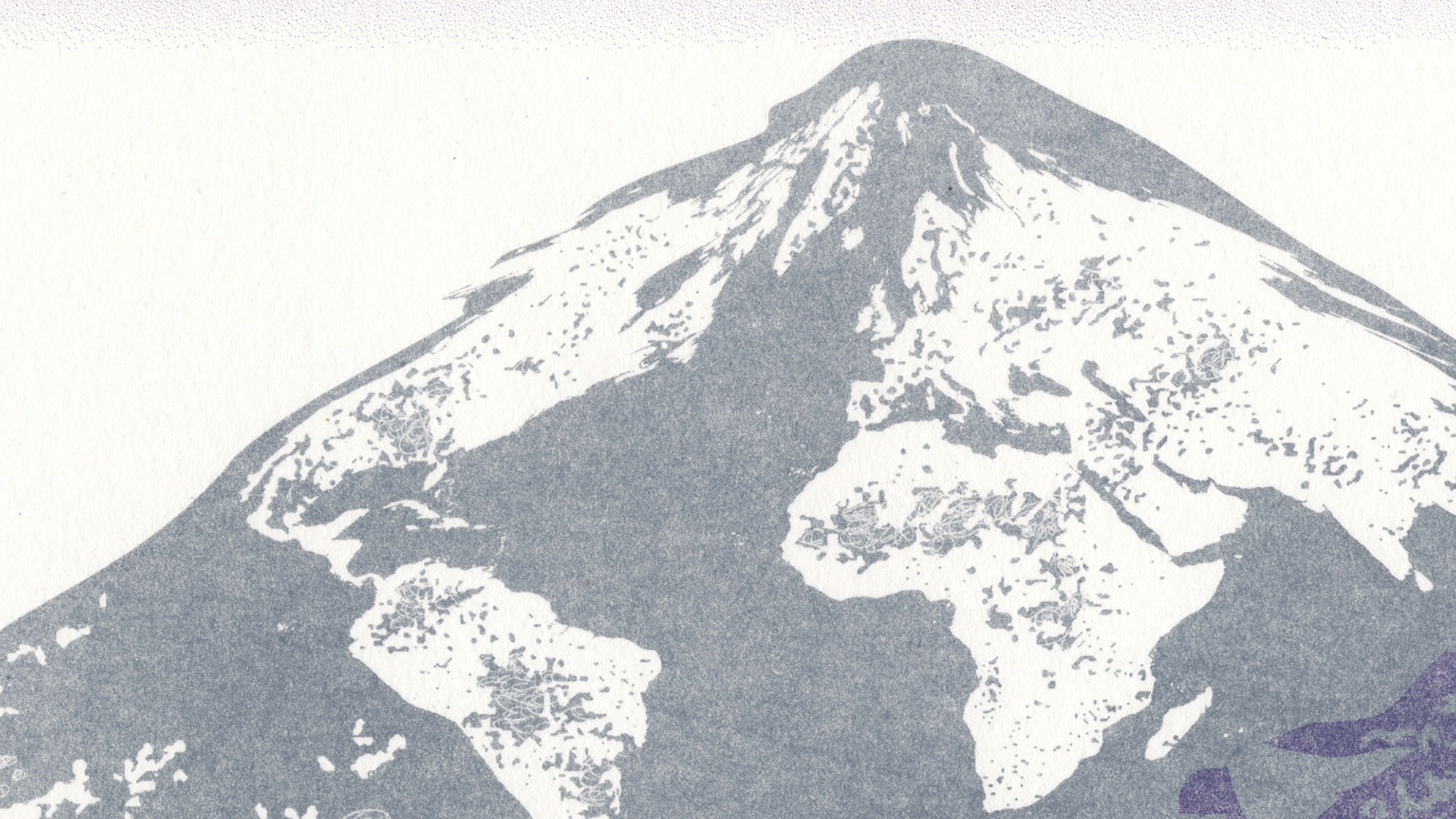 This is a 22 × 15 in color lithograph print (edition of 12) made with positive working photo plates and printed on Rives BFK paper. The map is based on the Foucaut Stereographic projection.